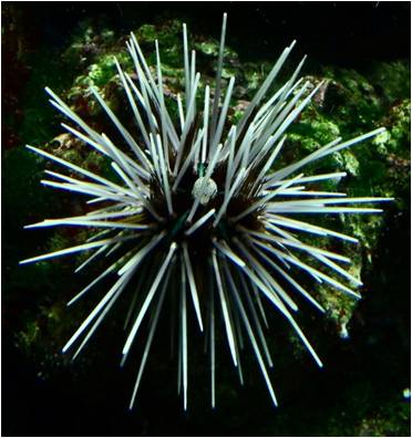 有著大顆藍白相間斑點的肛乳突,幫助排泄,這種海膽有長粗及細尖兩種棘刺,長者末端截平色白或黑白相間成環紋,細者較短呈紅棕色具毒性。