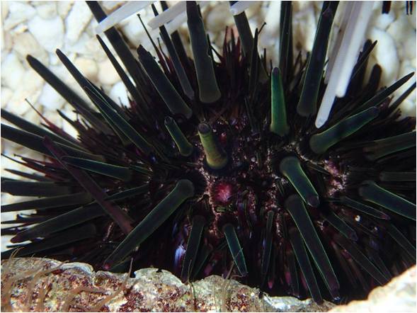 棘刺粗長表面粗糙,在水中呈螢光墨綠色。體殼可達10公分以上,為大型海膽。