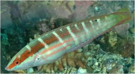 體側具 6條黄橙色至藍黑色寬橫帶,橫帶於背側較暗色,腹側較淡色,其中第三條橫帶末端近臀鰭處形成一深黑斑;體側另有3條粉紅至橙色細縱帶。背鰭黑褐色,臀鰭粉紅至橘紅色,末稍具3 條淺藍縱紋;尾鰭黃褐色,具一紅色的半環紋,環紋前或有少許紅色斑點。